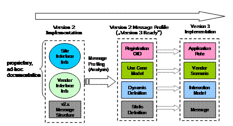 Die in der HL7 Version 2 vorgegebenen Nachrichten verlangen zusätzliche Informationen, die relativ "statisch" umgesetzt werden. Dazu gehören bspw. Restriktionen der Feldlängen, von Rekursionen, die Interpretation von Segmentinhalten oder das Vorhandensein von Vor- und Nachbedingungen für eine Nachricht. Im Falle der Nutzung einer Schnittstelle kommen noch weitere Einschränkungen hinzu wie bspw. die Festlegung auf bestimmte Kataloge, die umgekehrt nicht komplett wiedergegeben, sondern nur referenziert werden sollten. Bei genauer Betrachtung decken sich diese Informationen mit den statischen und dynamischen Definitionen sowie den diversen Szenarien im V3 Standard.