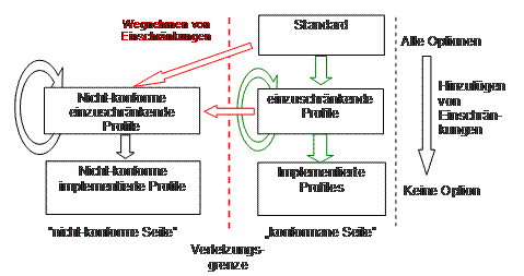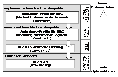 zur Umsetzung mit der Version 2.8 vorbereitet wird. 3.4.1 NachrichtenprofileNachrichtenprofile bilden eine Hierarchie dar, d.h. ein Profil baut auf einem anderen auf. Hierbei gilt es gewisse Regeln zu beachten. So dürfen in dieser Ableitungshierarchie nur Einschränkungen vorgenommen werden. Wenn bspw. ein Element (z.B. Feld) in einem Profil "Required" ist, so darf es in der Ableitung nicht wieder auf "optional" oder sogar "nicht erlaubt" gesetzt werden. (Die möglichen Übergänge sind in Kapitel 2 von HL7 v2.x erläutert.)