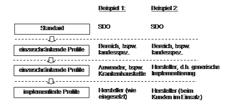 Nachfolgend 2 Beispiele für eine solche Hierarchie. Im ersten Beispiel gibt es eine nationale Vorgabe, auf der dann eine Krankenhauskette einen Hausstandard fordert, der dann von einem Hersteller umgesetzt wird. Im Beispiel 2 baut ein Hersteller auf der nationalen Vorgabe in generischer Form auf, d.h. in einem konkreten Einsatz kann das noch einmal gezielt verfeinert/ eingeschränkt werden:
