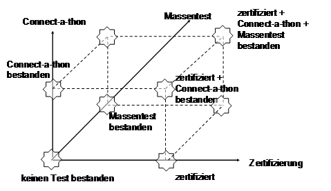 Die erste Variante wird bereits beim IHE Connect-a-thon eingesetzt. Hierbei wird geprüft, ob ein System in einem gegebenen Kommunikationsszenarium die Daten verarbeiten kann, die ein anderes System ihm schickt. (Ein Abgleich der dabei übermittelten Nachrichten wird mangels Zeit eigentlich immer unterlassen.) Letzteres zeigt den pragmatischen Ansatz von IHE. Es kommt darauf an, eine erfolgreiche Kommunikation zwischen den unterschiedlichsten Systemen zu demonstrieren. Dabei sind Nachbesserungen vor Ort zugelassen. Das Ergebnis des Tests wird dann für Messen und Demonstrationen aufgehoben. Dieses pragmatische Vorgehen impliziert aber auch, dass auf diese Weise keine Software entsteht, die durch Kunden offiziell gekauft werden kann. (Es kann nicht unterschieden werden, ob ein Hersteller einen sehr rudimentären Prototypen oder ein fast fertiges Produkt testet. Über den Vergleich der Ergebnisse vergangener Tests kann zwar recherchiert werden, dies ist aber sehr mühsam und garantiert dabei nicht die Produktreife einer getesteten Software.) Bei der zweiten Variante hat ein Hersteller viele (mehrere tausend) Nachrichten einzureichen, von denen dann eine repräsentative Auswahl (mehrere Hundert) automatisiert überprüft werden. Diese Form wird bspw. von AHML [AHML] favorisiert. Die Prüfung orientiert sich dabei an recht generischen (syntaktischen) Regeln, die mitunter nicht unumstritten sind: So wird bspw. bei einem einfachen Datentyp geprüft, ob es noch eine zweite Komponente gibt. Da eine Prüfung dieser Art nur gegen constrainable Profiles durchgeführt werden kann, bleiben viele Problemfälle unentdeckt. Dafür ist eine solche Prüfung kostengünstig anzubieten, da auf keinerlei Spezifika eingegangen werden muss. Die dritte Variante stellt die sog. Zertifizierung von Schnittstellen [ZTG] dar. Hierbei hat ein Hersteller eine Spezifikation einzureichen, die eine gültige Einschränkung eines (einzuschränkenden/Constrainable) Nachrichtenprofils darstellt. Im ersten Zertifizierungsschritt wird dann geprüft, ob diese Spezifikation tatsächlich eine gültige Einschränkung darstellt. In einem zweiten Schritt muss der Hersteller dann beweisen, dass seine Software der eigenen Spezifikation entspricht. Aufgrund des (derzeit) hohen Grades an manueller Prüfarbeit (Prüfung der Spezifikation, Konfiguration des Systems, Eingabe der Daten aus dem vorgegebenen Testszenario) ist dies eine teure Variante. Allerdings werden auf diese Art die meisten der Problemfälle entdeckt. Mit diesen drei Varianten wird ein orthogonaler Raum aufgespannt: