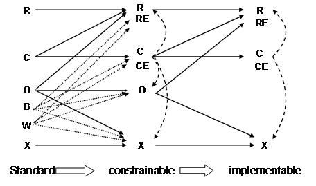 The top level represents the standard itself, i.e. it has the biggest amount of optionalities. For a "constrainable profile" optionalities are somewhat limited already. However, some choices still exist which are eliminated with "implementable profiles". For each information item a statement must be provided whether it is supported or not. The standard clearly defines, what can be done with the various optionalities to come to an "implementable profile": Table 2: "HL7 Optionality and Conformance Usage"