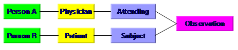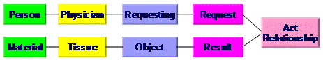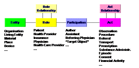 These six basic classes (Figure 5) consist of four base classes and two relationship classes: An entity is the representation of physical, persistent objects. Beside persons, materials and equipment also organizations and places belongs here. An entity expresses a static thing. A role (role) expresses the ability that an entity has. For example, a person may play the role of patient. A participation describes the incorporation of an entity into a certain role in one act. For example, a person in the role of physician participates in a surgery activity as the executive surgeon. An act the carrier for all information and expresses changes. For example, a finding is an observation and hence an activity. In addtion to these four base classes two classes are provided in order to realize relationships: A role link is a direct relationship in various roles such as employer / employee. However, this is used very rarely. An act relationship combines various activities. For example, the activity of observing is the fulfillment of the activity order. These six base classes can be put together in an instantiation in myriad ways. For example the following construct represents that "person A" participates as a physician in an examination of the patient "person B".