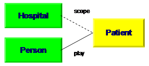 Another speciality are the different relationships of roles related to entities. The following graph represents this as indicated by the solid and the dashed line. It is assumed that a role requires a certain context. Thus, a person becomes a patient only in the context of an organization (in this case a hospital).