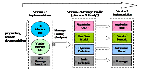 A first executable approach was presented at the 2001 IHIC in Reading: [SchoOem2001] 3.4. Documentation of the interfaceThe most important step for successful interoperability is a good documentation of the implemented interface. Unfortunately it must be noted that most manufacturers do not have such. If they are ever able to provide a written documentation, in many cases it is a copy / extraction of the original standard. In order to achieve a clarification in case of failure, an accurate understanding of system behavior is essential. Therefore it is necessary to enrich the documentation with more information. Last but not least, the customer has a right to a full and correct documentation. One difficulty, however, is the fact that when "customizing" the interface hidden configuration details must be made transparent accordingly. The following graphic [Sing2003, SinJuu2001] illustrates that by accurate understanding of the interface behavior and appropriate documentation very much is done to prepare the migration of HL7 v2.x to V3 already.