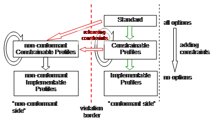 The HL7 version 2 messages require additional information that will be implemented relatively "static". These include restrictions, for example, the field lengths, amount of repetitions, the interpretation of segment contents or the presence of pre- and post-conditions for a message. In the case of using an interface, there are further restrictions such as the binding to specific catalogs, which should not be fully presented, but only referenced. On closer inspection, this information covers the static and dynamic definitions and the various scenarios in the V3 standard. The problem is the documentation with the so-called Proposal #605, which has been deposited in the Proposal Database and is currently in a multi-improved form (V07) prepared for implementation in version 2.8. The ECCF ( Enterprise Conformance and Compliance Framework ) of the SAEAF ( Services Aware Enterprise Architecture Framework ) project takes up this proposal. 3.4.1 Message ProfilesMessages profiles form a hierarchy, i.e. a profile is built on another. But one has to obey to certain rules. Hence, in this derivation hierarchy only restrictions can be added. For example, if an element (e.g. field) in a profile is "REQUIRED", it may not again be derived to "optional" or even "not allowed". (The possible transitions are described in Chapter 2 of HL7 v2.x.)