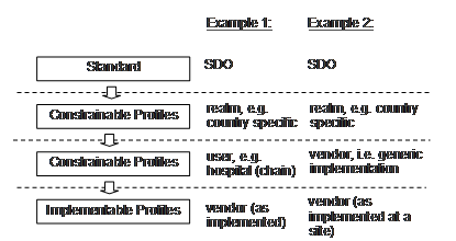 Below 2 excamples for such a hierarchy are listed. In the first instance there is a national guidance, on which a hospital chain bases its request, which is then adapted by a vendor. In Example 2, a vendor builds on the national guidance in a generic form, that can be refined onto the ultimate targeted application: