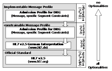 On the one hand (apart from the XML tools) implementations based on that have a certain advantage, if the structures are clearly identifiable. On the other enhancements lead to incompatibilities. 3.13. v2.x: Message ProfilesThe following hierarchy is used in Germany: Based on the original standards, a translation / interpretation was made over the past 15 years. This informative - but unofficial - version is the basis for the message profiles, which was also balloted by the HL7 user group and are thus regarded as normative. On this basis, vendors can then define and implement any additional restrictions: