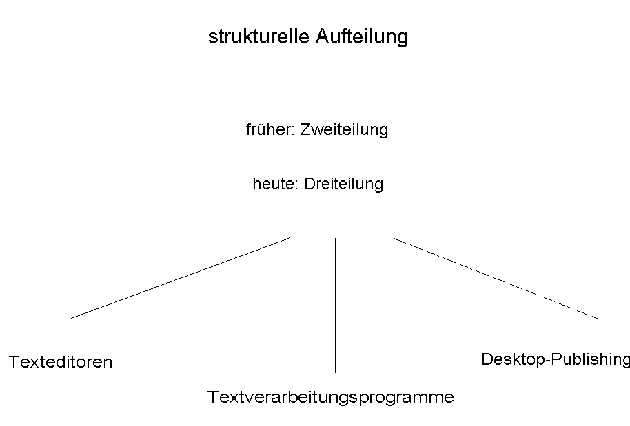 Bei den Texteditoren handelt es sich um Programme, die ASCII-Texte verarbeiten, d.h., sie können keine spezifischen Steuerzeichen lesen bzw. zurückschreiben. Die Texte bestehen aus einer Abfolge von Zeilen, die hauptsächlich die üblichen druckbaren Zeichen und Tabulatoren enthalten. Diese Texte dienen fast ausschließlich dazu, Programmtexte zu erfassen und anschließend von Compilern übersetzen zu lassen. Die Funktionalität ging ursprünglich von einfachen Kopier-, Verschieb- und Löschfunktionen sowie Laden und Speichern der Texte aus. Heute jedoch sind diese Funktionen oftmals dahingehend erweitert worden, daß sie wesentlich ausgeklügelter sind und nicht nur einfaches Kopieren, sondern auch bspw. zeilenweises, blockweises und/oder zeichenweises Kopieren erlauben. Weiterhin gibt es die Möglichkeit, über einen "Macro-Recorder" ein Macro zu definieren, das der Benutzer bei wiederholtem Gebrauch immer wieder aufrufen kann, um sich dadurch eine bestimmte Tastenfolge zu ersparen. Ebenso gibt es sogenannte "Tag-Files", die es bei einer Menge von Programmdateien ermöglichen, für eine bestimmte Programmiersprache ein Verzeichnis anzulegen, das den Dateinamen und die Zeilennummer enthält, wo der Source-Code einer bestimmte Prozedur/Funktion definiert ist. Auf diese Art und Weise kann der Programmierer während der Programmerstellung auf Tastendruck an die Stelle springen, wo der Programmtext der Funktion, die er gerade benutzen möchte, steht. Dies ist nützlich, um sich schnell einen Überblick darüber zu verschaffen, welche Parameter diese Funktion hat bzw. welche Funktion sie genau erledigt. Im Gegensatz dazu sind Textverarbeitungsprogramme in der Lage, Texte mit Steuerzeichen abzuspeichern. Das bedeutet, daß sie neben der reinen Textinformation Formatieranweisungen umfassen, die dann schon beim Erfassen und natürlich auch später beim Ausdruck dazu dienen, Schriftarten oder aber Einrückungen und Ähnliches zu bestimmen. Die Dateien, die von diesen Textverarbeitungsprogrammen erzeugt werden, dienen weniger dazu, als Eingabe für Compiler o.ä. verwendet zu werden, sondern Schriftstücke auszudrucken, die später für Briefe, Artikel, Zeitungsanzeigen, Bücher usw. genutzt werden. Bei Verwendung von spezifischen Steuerzeichen wird sofort der große Nachteil ersichtlich, der in der Inkompatibilität der Dateiformate resultiert, so daß verschiedene Textverarbeitungsprogramme Dateien nicht direkt miteinander austauschen können. Die Textverarbeitungsprogramme müssen noch in zwei Unterklassen unterteilt werden, wobei die eine Klasse die Dialogprogramme umfaßt, d.h. der Benutzer tippt seine Texte in dem richtigen Textverarbeitungsprogramm ein, wobei es durch Funktionsaufrufe über Funktionstasten, Control- oder Escape-Sequenzen gesteuert wird. Die zweite Klasse arbeitet nach dem Filter-Prinzip, wobei die Texte mit Texteditoren erstellt werden und dann von diesen Filterprogrammen aufbereitet werden, so daß sie auf einem Drucker ein entsprechendes Layout besitzen. Dabei muß erwähnt werden, daß die Steuerzeichen in Form von ASCII-Sequenzen wie z.B. "{new-page}" oder ".pb" für einen festen Seitenumbruch eingegeben und von den Filterprogrammen umgesetzt werden müssen. Bei der weiteren Betrachtung soll unberücksichtigt bleiben, auf welche Weise die Steuerzeichen eingegeben werden und ob es sich bei den Textverarbeitungsprogrammen um Dialog- oder Filterprogramme handelt. Wichtig ist jedoch, daß die Textverarbeitungsprogramme verschiedenen Philosophien gehorchen, die konzeptionell unterschiedliche Vorgehensweisen bedingen. Da sei zunächst ein seitenweises Layout erwähnt, d.h., jede Seite wird einzeln eingegeben und ist als getrennte Einheit zu betrachten. Dieser Ansatz wurde damals wegen des zu kleinen Hauptspeicherbereiches entwickelt, hat sich aber in der Praxis nicht bewährt, da es auf diese Art und Weise relativ kompliziert ist, Textteile über das Seitenende hinaus zu verschieben. Diese Aufgabe tritt aber gerade bei der Überarbeitung längerer Textpassagen häufiger auf. Auf dem freien Markt haben sich zwei andere Konzepte durchgesetzt: Das erste geht davon aus, daß der Text hintereinander weggeschrieben wird, wobei der Benutzer für bestimmte Attribute oder Formate unterschiedliche Steuerzeichen einfügen kann. Beispielsweise kann für eine Auszeichnung eines Wortes das Attribut "unterstrichen" verwendet werden. Dabei bleibt dann unberücksichtigt, welche Schriftart und -größe eingestellt ist. Das zweite Konzept geht davon aus, daß immer eine komplette Beschreibung dessen geben wird, was mit einem bestimmten Textteil gemacht werden soll. Das heißt bei unserem Beispiel der Auszeichnung, daß nicht nur angegeben werden muß, daß sie unterstrichen ist, sondern auch gleichzeitig, daß sie nicht fett, nicht kursiv und nicht gesperrt ist und um welche Schriftart und -größe es sich dabei handelt. Genau wie bei den Texteditoren hat sich bei den Textverarbeitungsprogrammen die Funktionalität erhöht. So enthält heute jedes Paket neben der Grundfunktionalität, die schon die Texteditoren bereitstellen, mindestens einfache Hilfefunktionen, ein Rechtschreibewörterbuch und einen einfachen Macro-Recorder. Darüber hinaus stellen viele Programme sogenannte Page-Preview-Funktionen zur Verfügung, die es gestatten, den Text ganzseitig in einer Art anzuzeigen, die dem Autor eine Vorstellung von dem endgültigen Aussehen gibt. Diese erweiterten Funktionen werden in neueren Programmversionen sogar in noch ausgeklügelterer Form angeboten. So ist die Hilfe nicht allein global zu sehen, sondern kontextsensitiv, d.h., daß in einer bestimmten Funktion das Programm weiß, nach welcher Hilfe gefragt ist bzw. der Benutzer das Programm in einer unklaren Situation sogar "fragen" kann, warum es bestimmte Funktionen nicht wie gewünscht ausgeführt hat bzw. welche Funktionstasten der Benutzer hätte drücken müssen, um eine bestimmte Funktion auszuführen. Ebenso ist das bereitgestellt